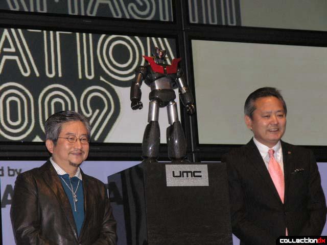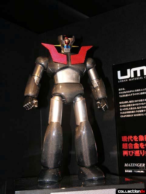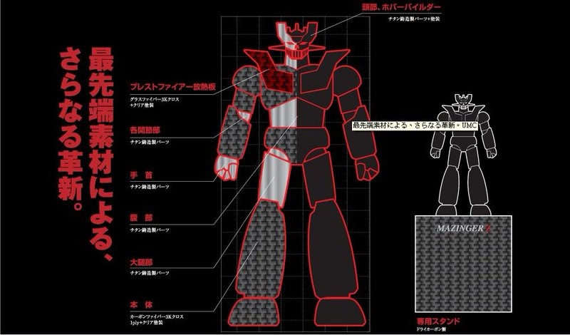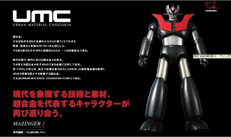 日本BANDAI公司採用最新尖端的材料與技術,配合最具有代表性的卡通角色,Urban Material Chogokin第一彈產品 “Mazinger Z" 於是乎誕生了! 這次的超級企劃, 將太空科技常用的鈦金屬(TITANIUM), 與具有高硬性的輕質量碳纖維(CARBON)運用在人人皆知的無敵鐵金剛上,鈦合金比"銅"及 "不銹剛"還要輕60%, 但是卻擁有比銅,不鏽剛還要高上兩倍的高硬度,同時鈦合金還具有耐酸, 耐腐蝕性,在高溫下也不易產生化學變化而腐蝕,因 此,產生金屬疲勞的情況相當地少,碳纖維比鋁金屬還輕, 但卻跟金屬有相同的硬度,用這兩項材料用來製作不怕火焰與鹽酸強風的無敵鐵金剛,的 確是在適合不過了. 根據官方公佈的資料資料 : UMC合金鐵金剛全身高600mm,頭部,腰部,關節,拳頭,大腿採用鈦金屬鑄造零件,身體部分採用玻璃纖維,碳纖維製,並且 塗佈透明烤漆另外還有UMC合金鐵金剛專用展示檯(當然也是碳纖維作的啦~~~) 限量UMC合金無敵鐵金剛, 未來增值空間難以想像...